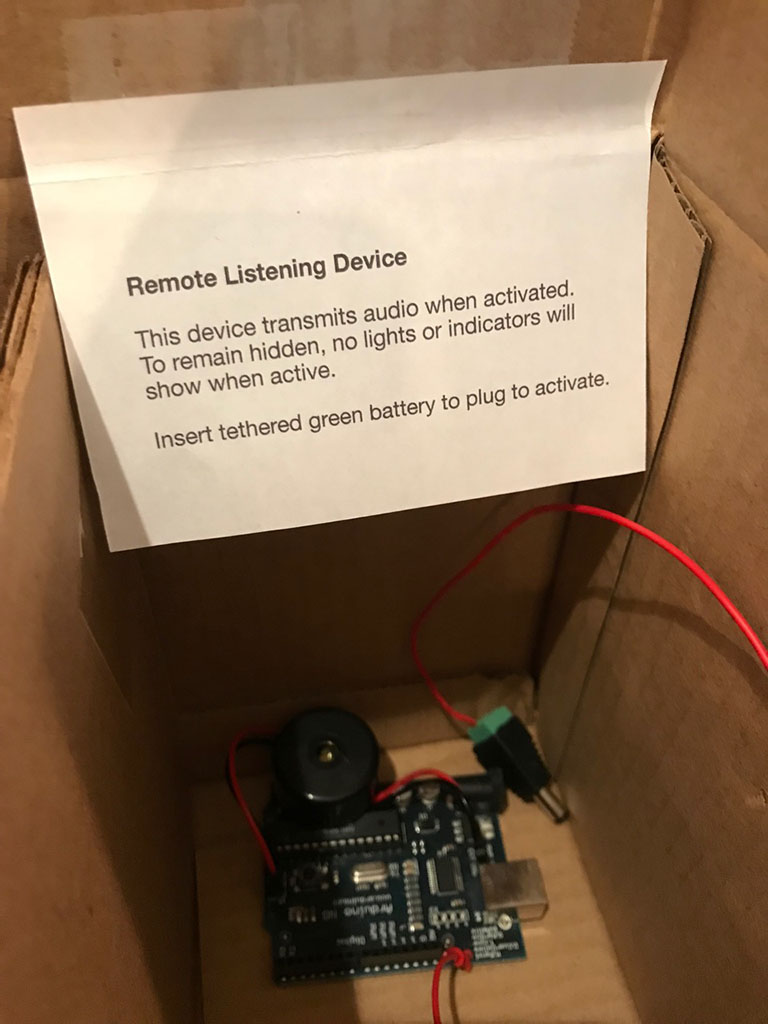 For their next task, they decoded another card hand and learned that a secret meeting was to take place in a nearby park. Headquarters instructed them to retrieve a Remote Listening Device from a box of supplies, go to the park, plant the device and return before the suspects got there. Using the device they would be able to listen in on the meeting and hopefully discover more clues. I created a somewhat plausable device using some old electronics I had. To explain away that the device didn't seem to do anything, the instructions noted that to remain hidden, no lights or sounds would come from the device when activated.