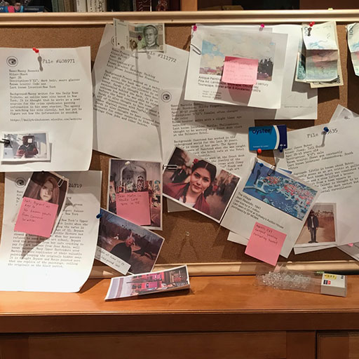 We didn't actually have a game built, however. Over a few evenings we tossed around different ideas for possible parts of the game. As more ideas were shared, we were able to sequence them into a timeline that felt like a playable experience. We considered pulling in neighbors to be actors, but settled on driving the story thorugh messages and clues that didn't require interacting with other, actual people.
