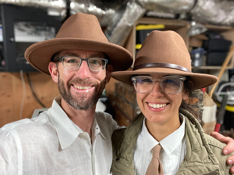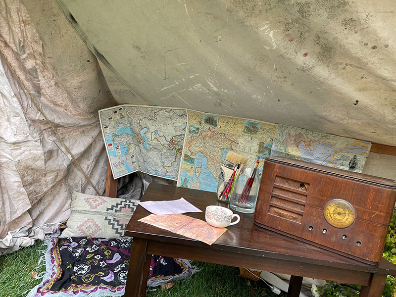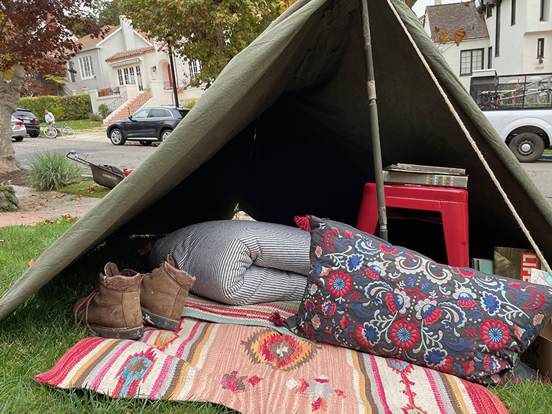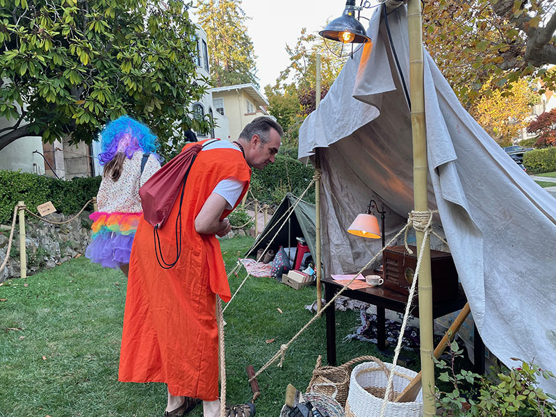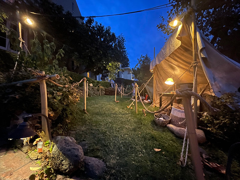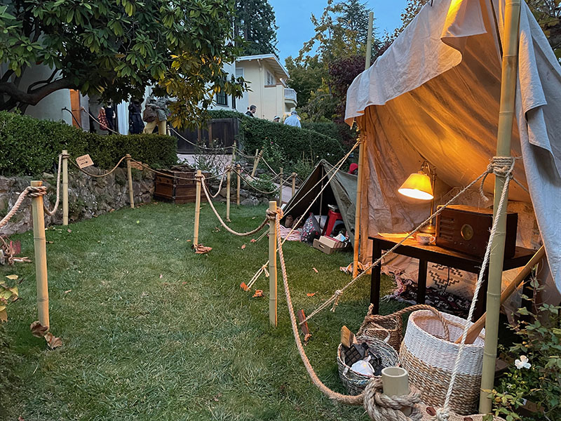 Saturday morning, the day before Halloween, Beth and I started building the camp in full. We planned to have a preview night with friends that night and wanted everything ready to go. We set up the army tent and constructed a larger tent using canvas painting drop cloths that would serve as Indy's office. We scoured our house for additional props and artifacts and Beth filled in the camp with amazing details. I brought back my old Boy Scout training to lash bamboo poles together and then hung the lights. By early afternoon the camp was complete.