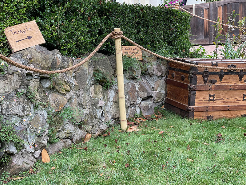 Over breakfast one morning I was chatting with my daughter about how we should decorate the front yard and we were listening to some recordings of background music from the Indiana Jones attraction with the idea it could be playing outside. In the Disneyland ride, the line enters through Indiana Jones' abandoned camp and a radio is playing period 1930's music. As we listened to the recording, it was interrupted with a news flash that announced the Temple of the Forbidden Eye is drawing visitors, but that people are going missing once they enter. The announcer speculates that they looked into the eyes of the Idle. Immediately I realized the attraction backstory worked perfectly for this project and decided the projection piece would not be the rolling boulder, but instead should be the first scene of the Disneyland ride where you encounter the large statue of Mara.