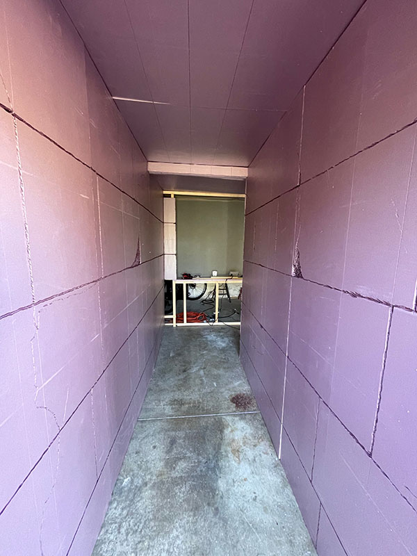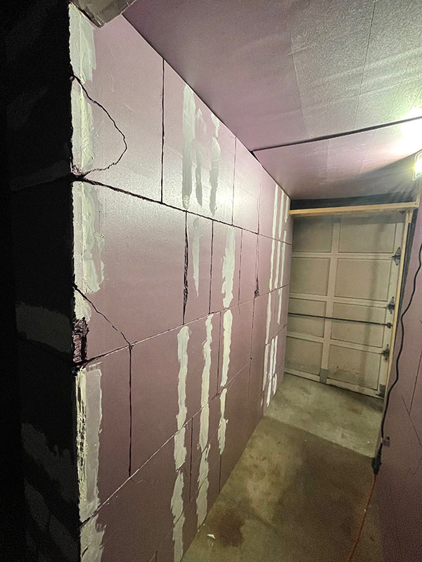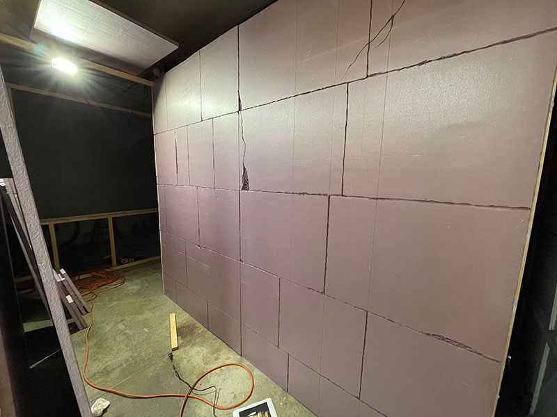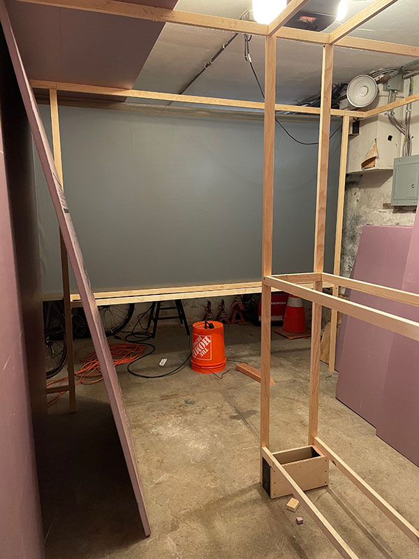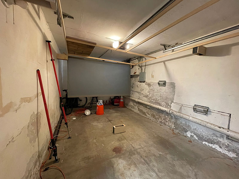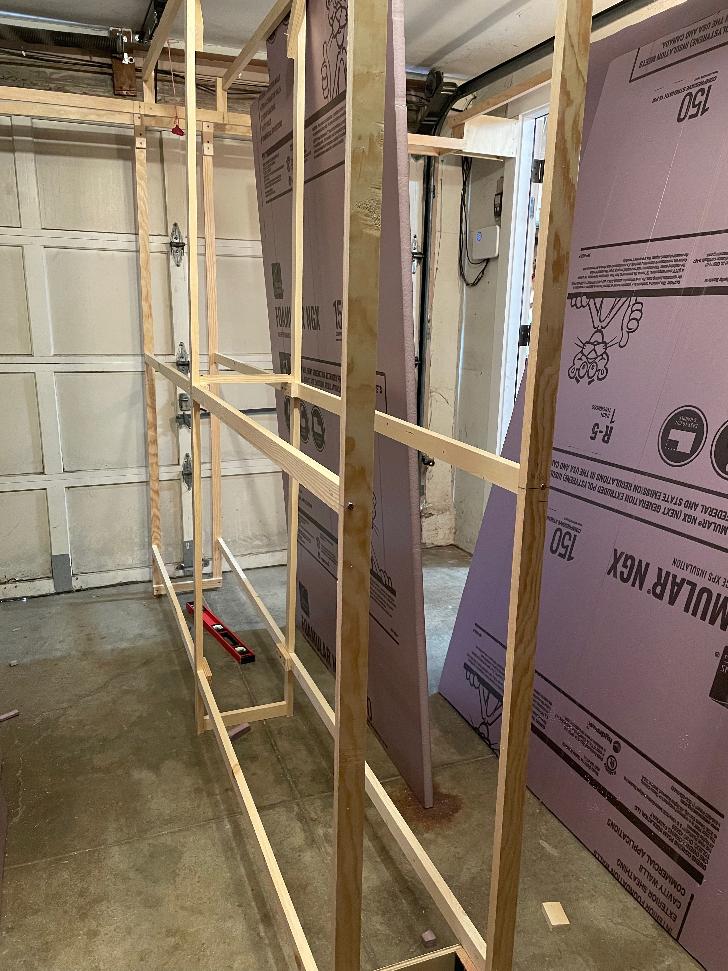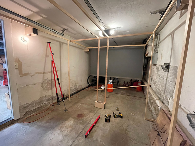 At this point I fully committed to a physical build along with the software build. I had enough confidence with the software, plus good initial outcomes with the stonework that I decided I could pull off both at a quality level I'd be happy with. After a final supportive conversation with Beth, I began to transform the garage into a temple fit for Indiana Jones to explore. Our house is almost 100 years old and the garage floor is far from level. I also wanted to ensure the garage door could continue to function, which meant I needed to build a room within the room, and do it from the ceiling, which is level, down to the floor, which is not.