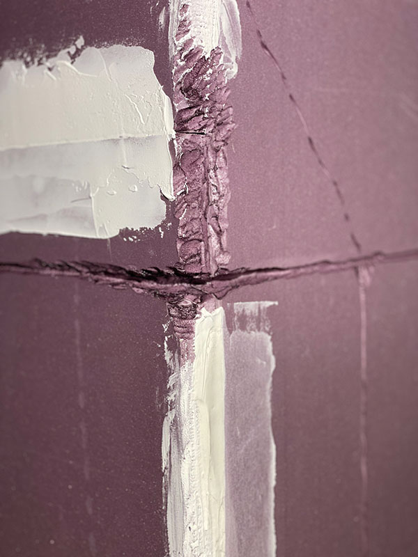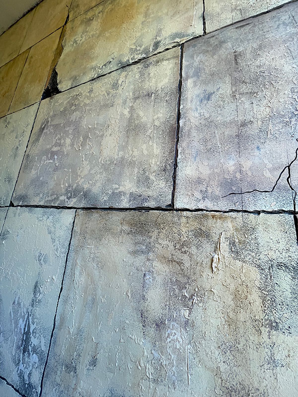 After the texture was dry, I began to paint. I rolled on the base coat with a varying amount of paint to let the darker mortar come through in spots. After it dried, I began weathering each stone individually with multiple washes of tempera paint. Originally I mixed tempera and water and then applied with a chip brush, but over time I learned I could put undiluted tempera onto the brush, dab it on the stone, then return with a water-wet brush to dilute the paint directly on the stone. I repeated this process for several layers, alternating between a 2 and 4 inch brush to get the color variation I wanted. Occasionally the wall would become too wet, so I used a paint roller to absorb excess water, and then dry brushed the paint back into place. In the larger cracks and voids, especially in the corners, I applied undiluted tempera, and in some spots I touched up with black and brown Sharpie markers.