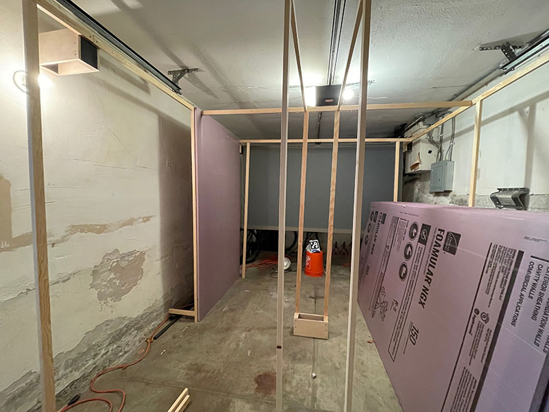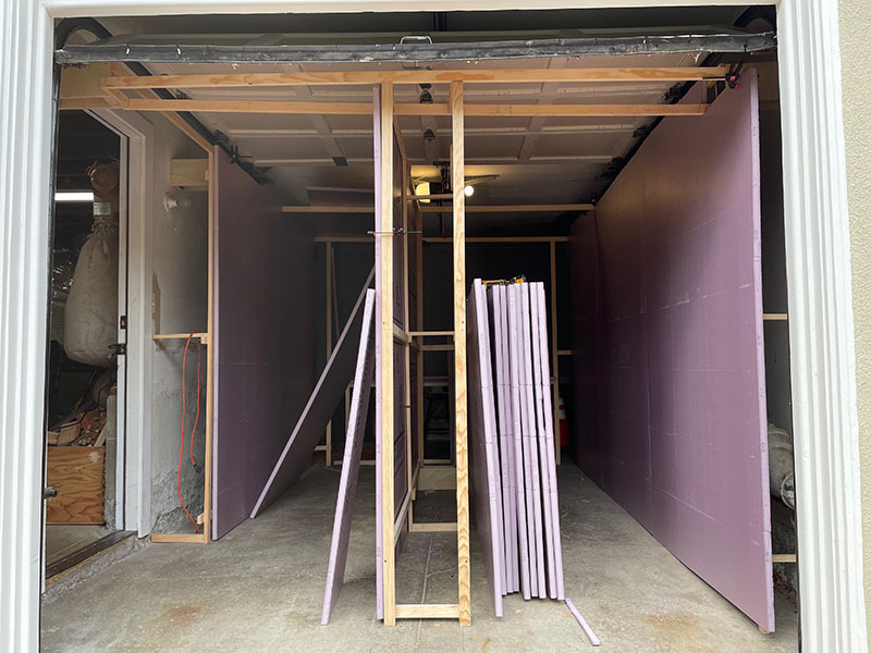 My workshop is connected to the garage through a single door, and I needed to make sure I could freely move work in and out. I left out the middle framing where the door was and left that panel detached so I could come and go. Also once most of the walls and ceiling were in place, I added work lights so I could see. At times I left the garage door open for natural light on weekends, but it remained closed when working in the evenings.