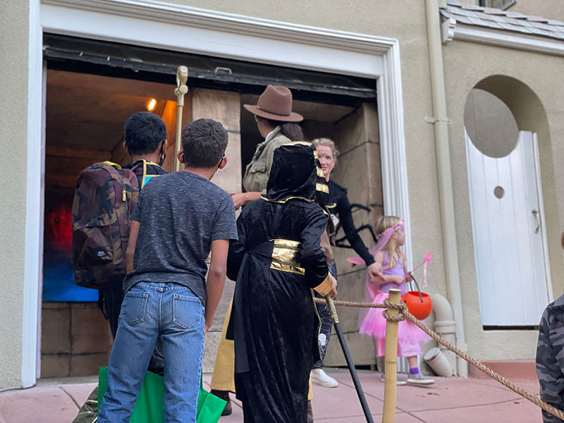 Although we couldn't keep an exact count, based on the amount of candy we went through we think we had about 550 kids and about 250 adults come through. Almost everything worked without a hitch. Somewhere in the evening somebody pulled on one of the wires in the temple, which broke the lights in the exit corridor, and the radio in the camp struggled to play music at times because the Homepod speaker I hid inside kept falling off the wireless network, I think from all the cell phones with in the area generating interference.