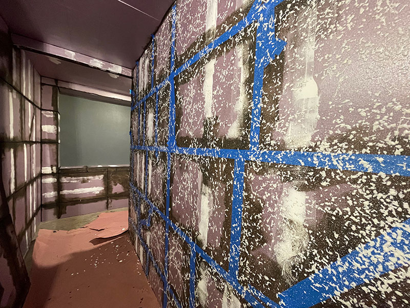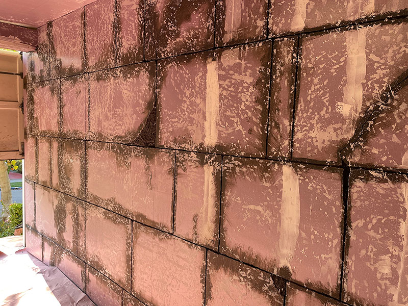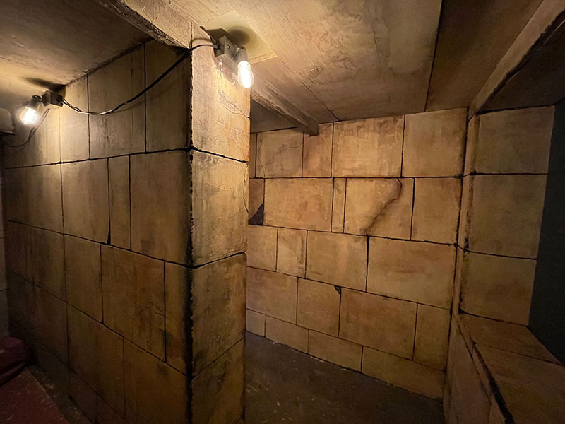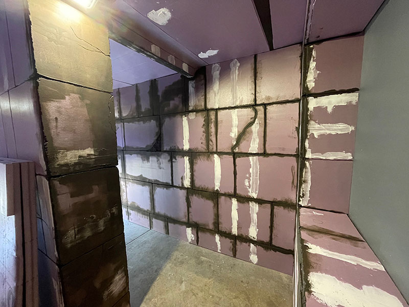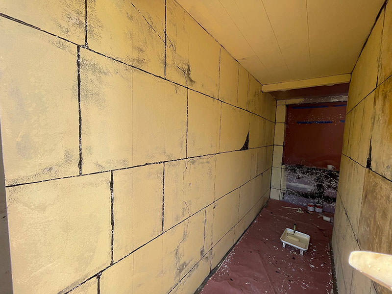 Next it was time to texture the walls. I did this entire process on the entrance corridor first, and actually changed my process for the exit corridor. For the entrance corridor I textured after I painted the mortar because I was worried about texture filling the carved mortar, so I spent a bunch of time masking off everything. This left noticeable gaps in the texturing where the tape was, so when I repeated the process for the exit corridor, I textured first and then painted.