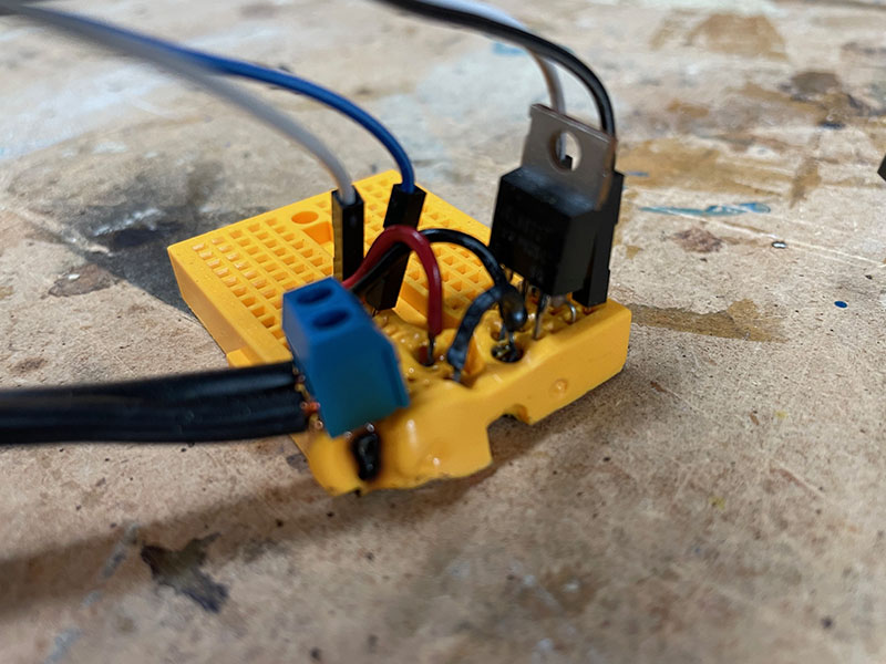 I did one final restart of all the software and let it run uninterrupted just to confirm nothing would crash as it ran for hours. It was at this point I smelled something burning in the yard. After hunting around I discovered that the dimmer I built had melted with the heat it generated. Although the dimmer was identical to the one I built for the temple, I theorized that because the cable runs were much longer between lights, the added resistance from the extra wire pushed the circuit beyond what it could handle. I quickly built a new dimmer with extra parts and tested it with half the lights. Over 45 minutes or so it too, became quite hot and was in the early stages of melting the breadboard. Although I was quite disappointed I would not have the signature lighting effect in the camp, I decided burning down my house was a worse option, so I removed the dimmer and instead hard wired the camp lights to power so they would remain on.