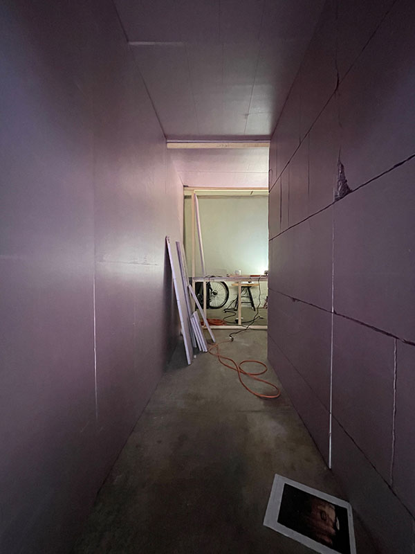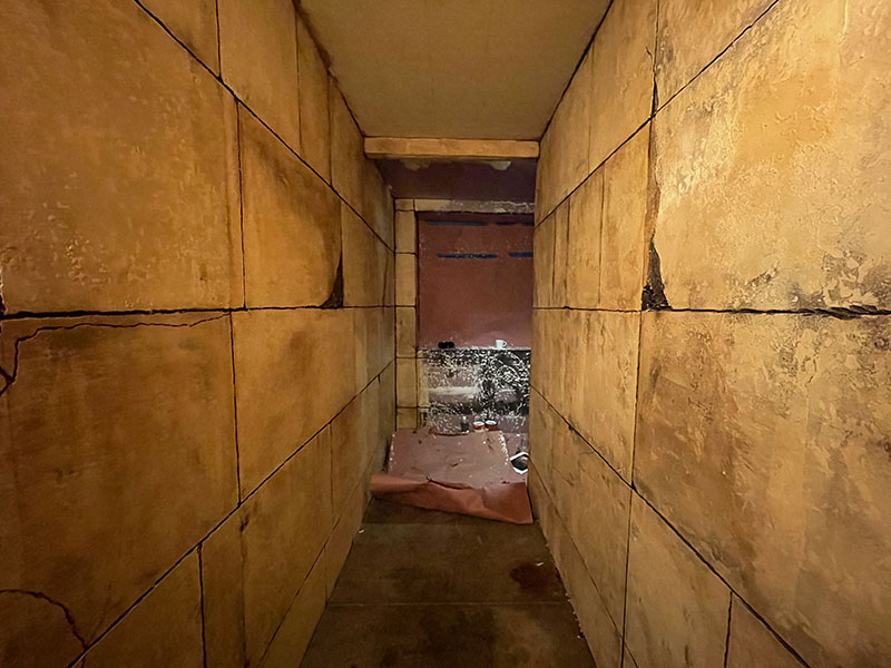 I was also rapidly realizing that the hallway required for this experience was going to be a major project on its own and that broke my rule of sticking to software as much as possible for this project. Extending across the sloping front lawn would require me to build a level floor to attach walls to and it probably needed a ceiling. It also needed to be sturdy enough for potentially hundreds of people to pass through. And it needed to look like a tomb inside and out, and not like a bunch of plywood. Although I know I have great neighbors, I could already imagine the awkward conversations as I took what would likely be several weeks to construct this thing in front of my house. But I had already been prototyping the projection piece in the garage. What if the entire tomb was in the garage? That would change the shape of the hallway from linear to a U shape, which would also mean I would have only one screen at the back, thereby reducing the cost of the project. Also, because viewers are walking towards the screen instead of across it, I only needed to manage a single viewer's perspective at a time, which would greatly simplify the software.