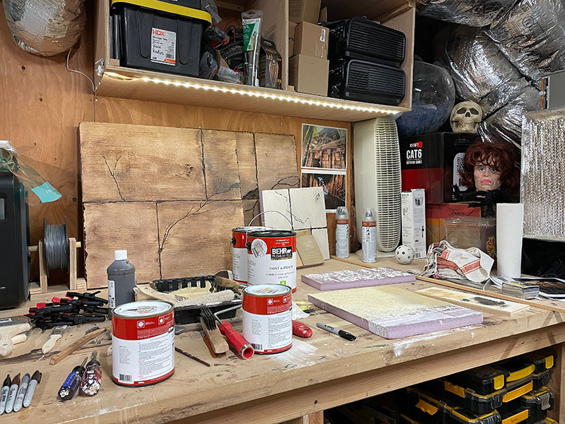 I built a tomb for one of my first projects and it was a great example of looking like a craft project. I rationalized at the time that it was in very low light, so you couldn't see the lack of convincing detail, but I knew this time I needed to be much better. I discovered a small industry that has popped up making faux rockwork panels for escape rooms and even more permanent panels for exterior architectural elements. I began pricing out what it would cost to get enough panels to cover the interior of my garage but at the same time I spent time reading articles about how people have made their own panels for craft and theatrical use. Extruded polystyrene foam (XPS) is used as insulation panels, often on basement foundation walls and other tight spaces. Unlike the foam board that is often used to pack electronics, XPS foam isn't made up of tiny beads that break apart. Its smooth surface can be carved with a very sharp knife, and also with heat.