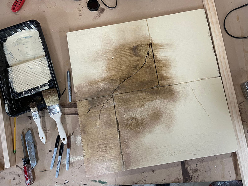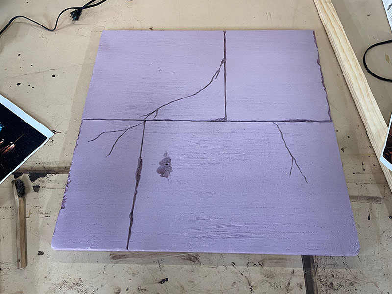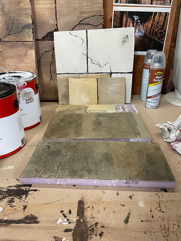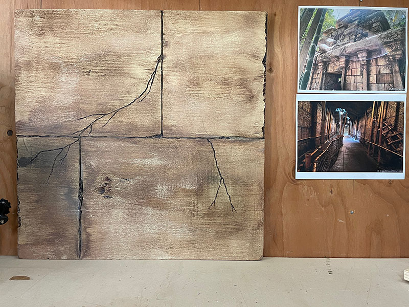 There is still a shortage of building materials but I was able to purchase a few 2 x 2 foot panels for experimentation. Armed with an old Radio Shack soldering iron, I practiced carving stone blocks into the panels to learn the best heat, pressure and speed to get the look I wanted. The large collection of Indiana Jones Adventure photos from Daveland Web served as an excellent reference for color, shape, and texture. as I experimented with several types of additional distressing like using wire brushes and sandpaper to further rough up the panel surface.