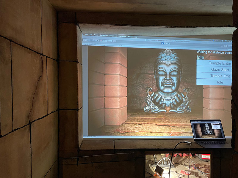 I wanted the temple scene to unfold as guests entered, so I built a state machine that sequenced the experience. I then defined areas of the physical temple that when the camera detected someone entering, the state machine would advance to the next sequence. Each spatial trigger was tunable, which allowed me to calibrate animations, sounds, and lighting to change when people reached specific locations.