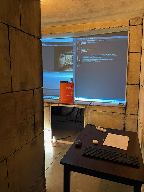 As I worked further to integrate the projection to the physical space, I found I needed to be working directly in the temple to test. I set up a makeshift office to continue debugging and refining the work. Coding on such a large screen was great!