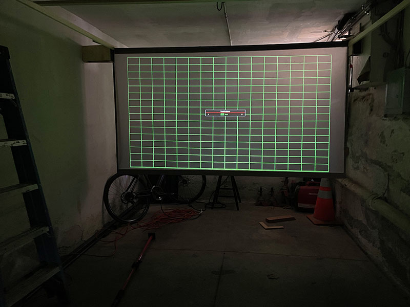 The projectors I have require 12 feet of distance to fill the 8 x 4.5 foot panel, which is almost the entire depth of my garage, so I knew I would need short a throw projector for this to work. After scouring reviews, I settled on ordering an Optoma GT1080HDR, which would require only a little over three feet to fill the screen. This would allow the screen to move back leaving about 12 feet of depth in the garage for the hallway. When the projector arrived, I determined the final position of the screen and began blocking out the dimensions for the remainder of the temple.