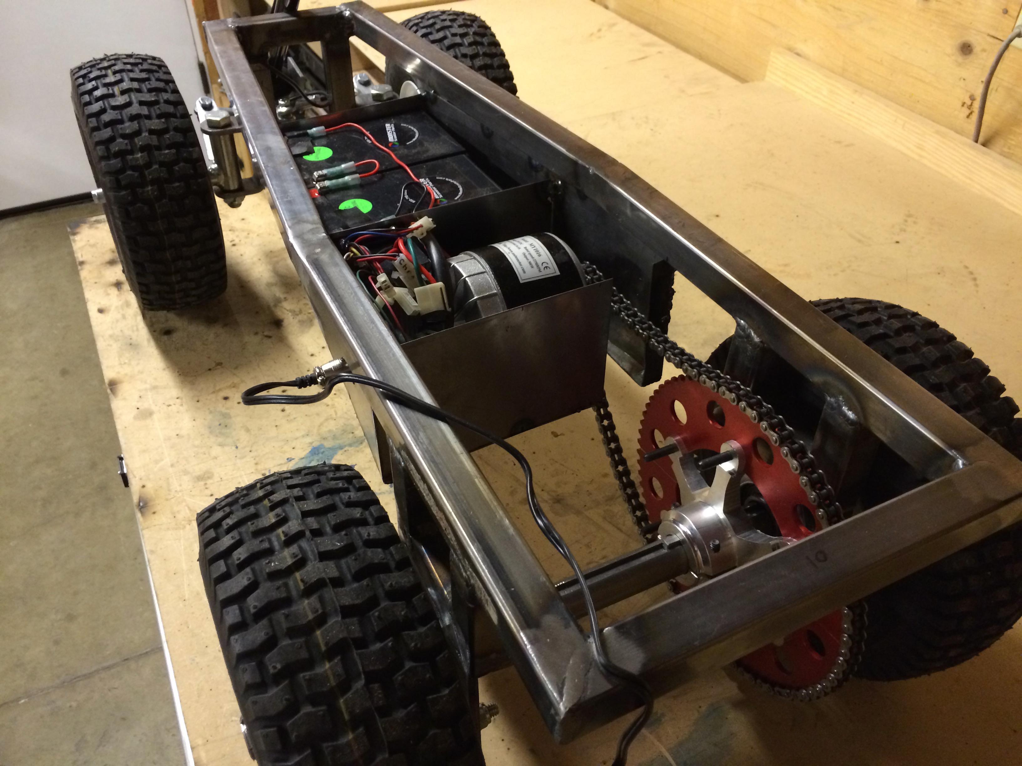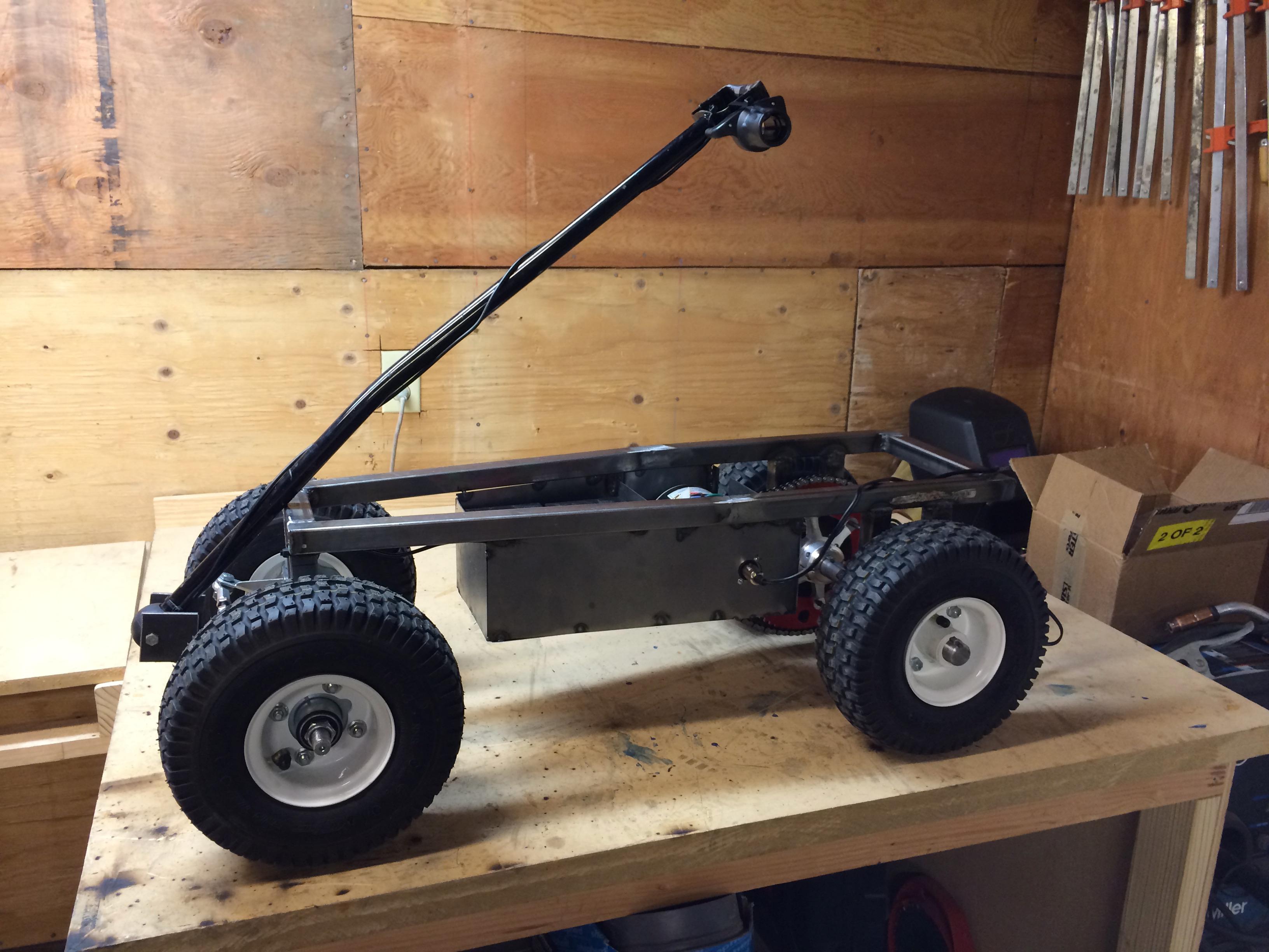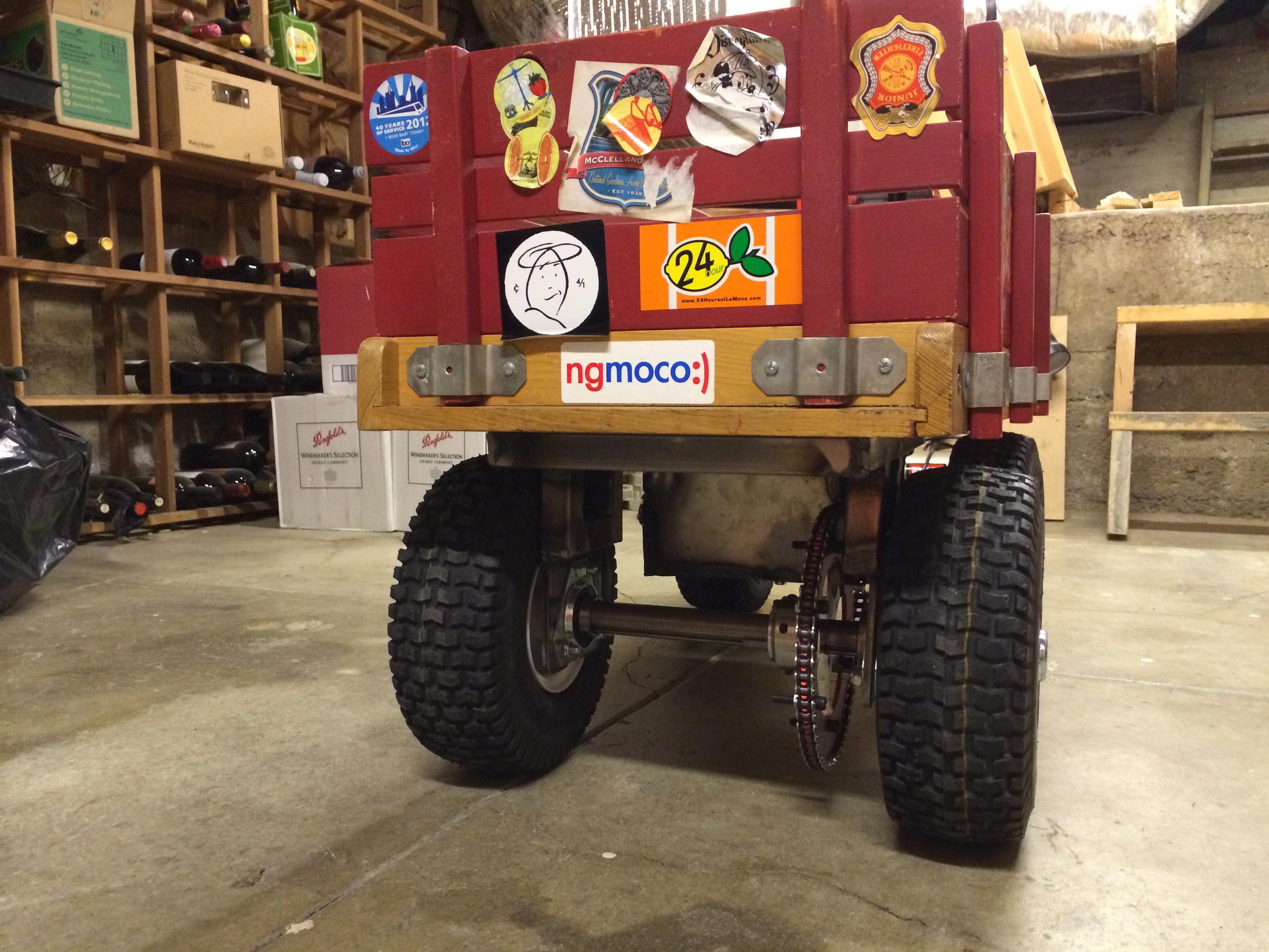 Our kids were getting older and heavier and pulling them back up the hill from Saturday Farmers Market was proving tough. I converted their Radio Flyer wagon to an electric drivetrain complete with rechargable batteries and a thumb controlled throttle on the handle for easy use.