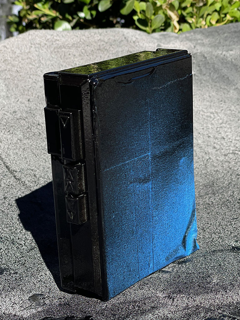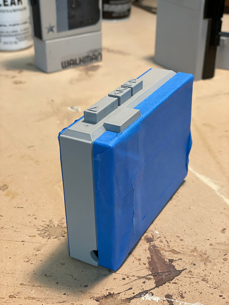 The Walkman was spray painted with a base layer of gray and then I masked off the outer ridge to paint it black.
