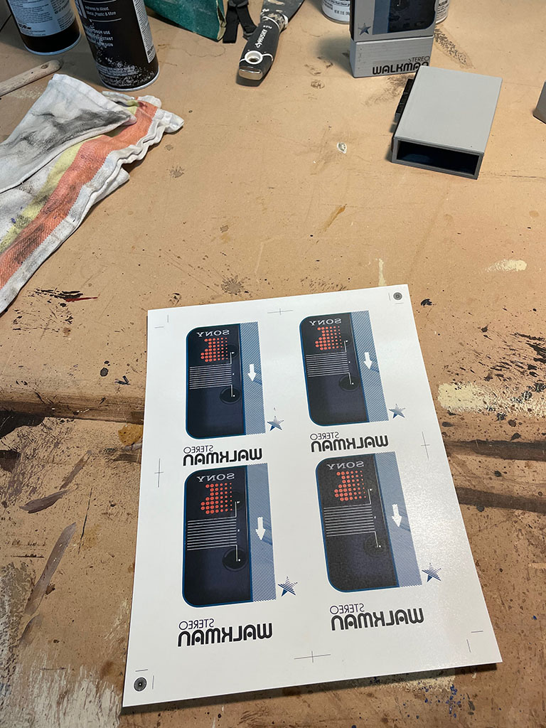 Finally I recreated the case graphics in Photoshop from source photos and then adjusted their proportions to attempt to hide the extra height of the replica. The graphics were laser printed onto clear waterslide transfers and then applied to the Walkman. Lastly a light clear coat was applied to ensure the graphics remain attached.
